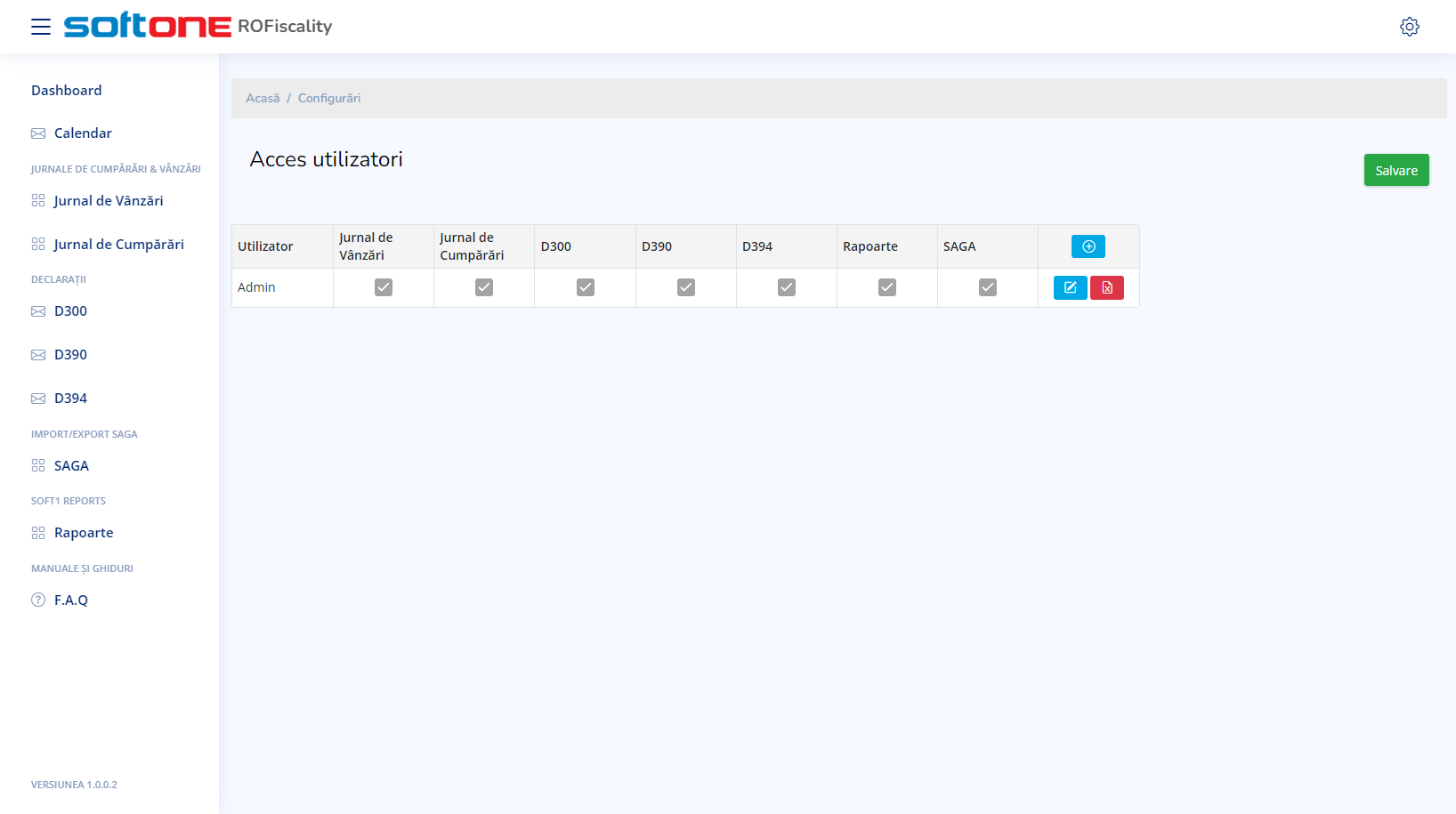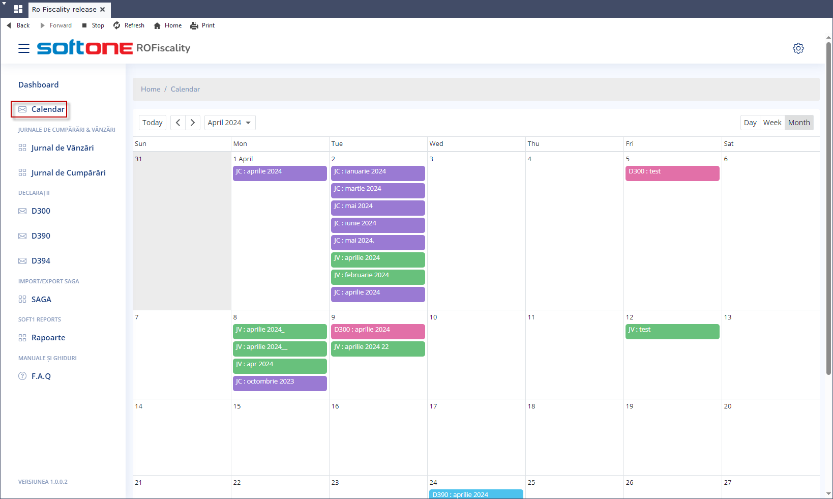 Aceasta cuprinde sectiunile: Calendar, Jurnale TVA, Declaratii fiscale, Rapoarte, Integrare cu SAGA.