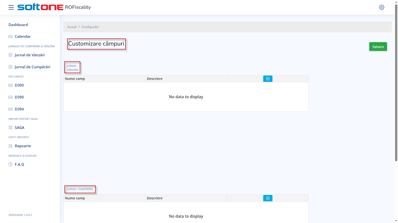 Cea de-a doua optiune Câmpuri custom se refera la posibilitatea de a defini campuri custom in jurnalele de tva. Numele campurilor din scripturile standard ale jurnalelor de tva trebuie pastrate si in scripturile custom. Campul Nume camp este eticheta dupa care se face maparea, iar campul Descriere este numele coloanei care se va vedea in ecranul jurnalelor de tva.