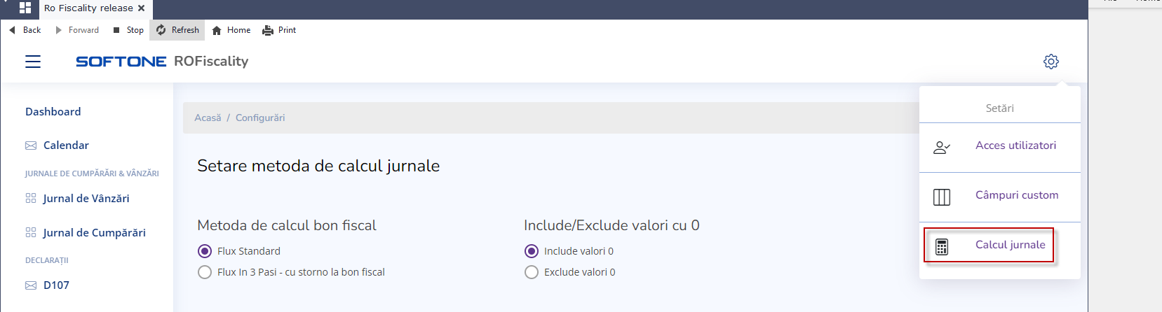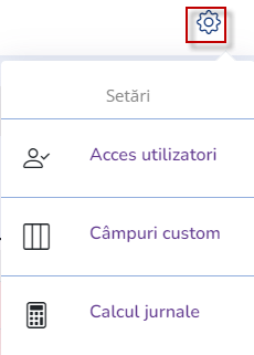 Platforma RO Fiscality cuprinde un buton de Setari (in partea dreapta sus):