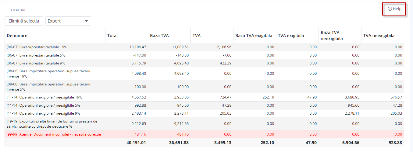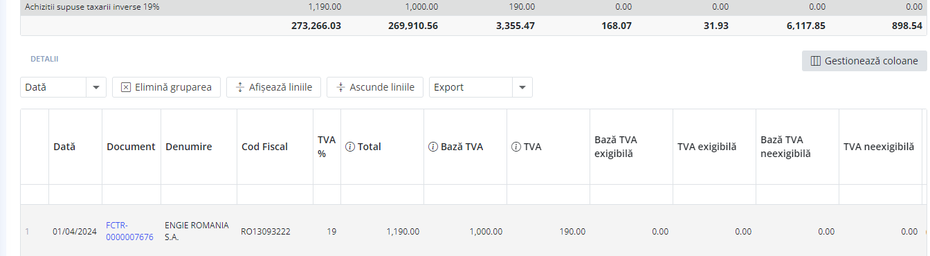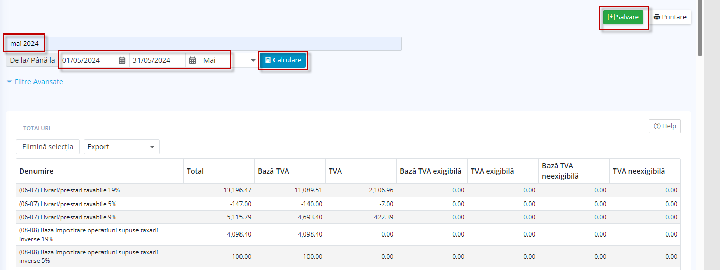 Campurile afisate sunt: Total, Baza TVA, TVA, Baza TVA exigibila, TVA exigibila, Baza TVA Neexigibila, TVA neexigibila. Aceste valori sunt citite din documentele de vanzare si de achizitie, din campurile de valoare si in cele din sectiunea de intrastat.