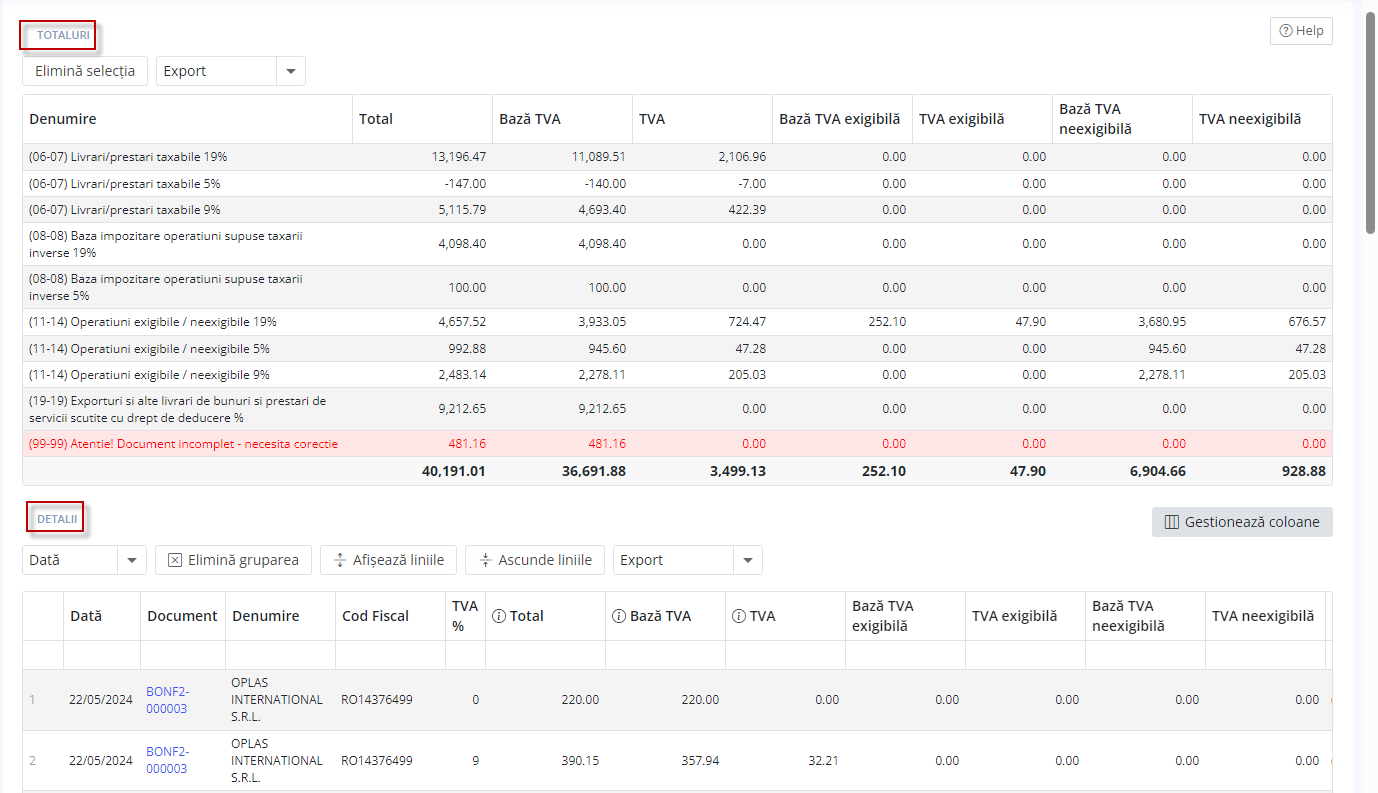 In sectiunea Totaluri sunt afisate coloanele din jurnalul de TVA, iar in sectiunea Detalii este afisata lista cu documentele pentru fiecare coloana.