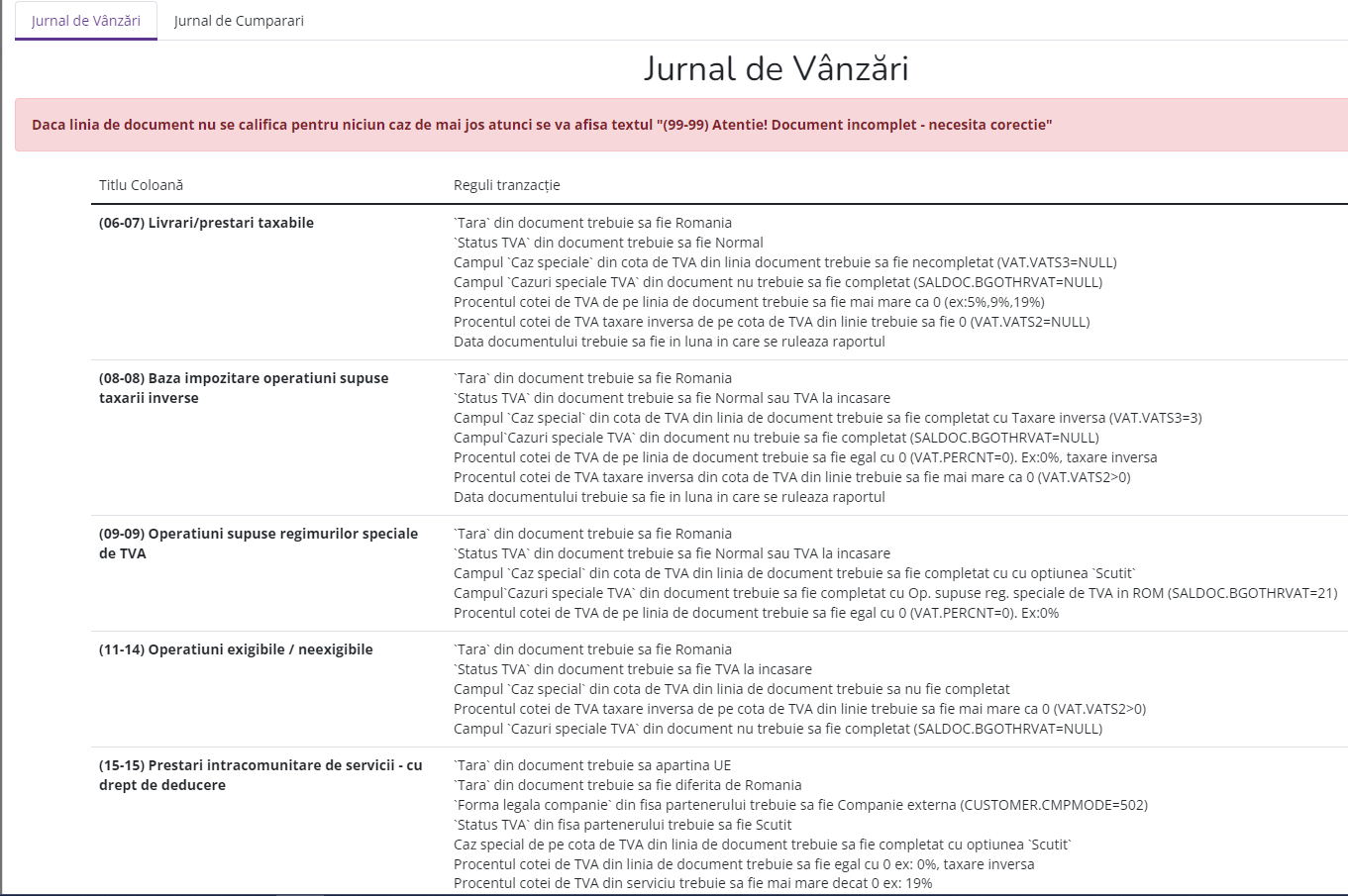 Un document care nu indeplineste cumulativ conditiile de incadrare in una din coloanele din jurnal, va fi incadrat pe coloana (99-99) Atentie! Document incomplet – necesita corectie si va fi necesara corectia unuia sau a mai multor campuri. Conditiile pentru ca un document sa fie afisat intr-o coloana sau in alta din jurnal se gasesc accesand butonul Help.