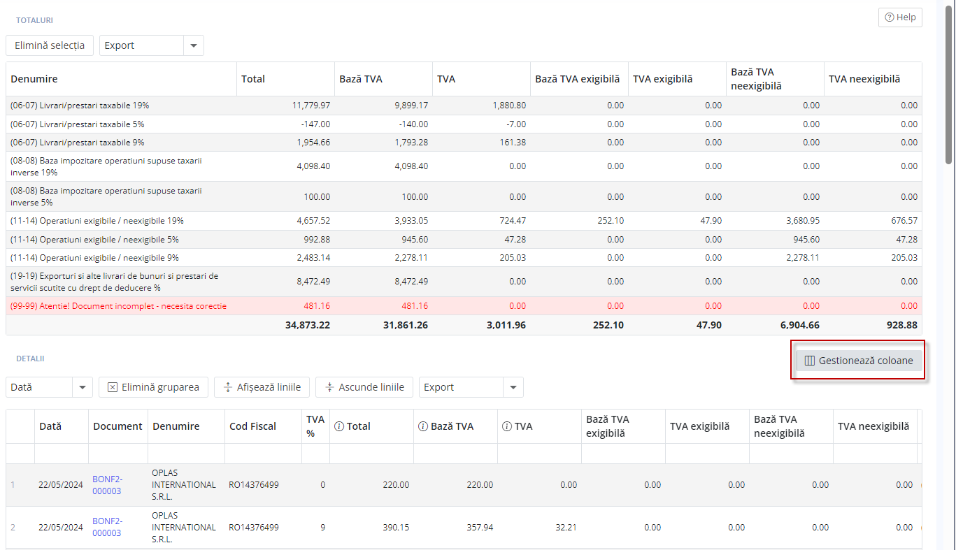 In jurnalul de vanzari se pot adauga coloane suplimentare utilizand butonul Gestioneaza coloane, din partea dreapta a ecranului, intre sectiunile de Totaluri si Detalii.