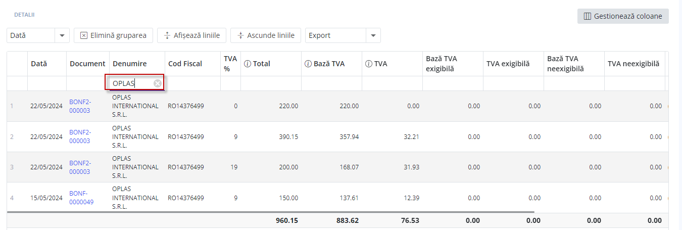 Filtrarea in jurnalele de TVA se poate face completand informatiile dorite in liniile de sub capul de tabel din sectiunea Detalii si apasand tasta Enter: