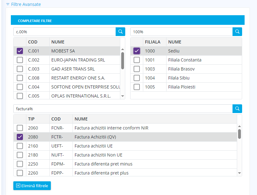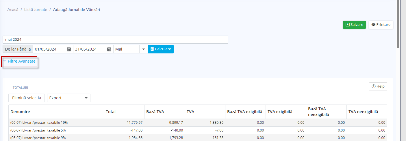 Daca se doreste filtrarea in jurnalele de tva dupa campuri suplimentare se acceseaza sectiunea Filtre avansate: