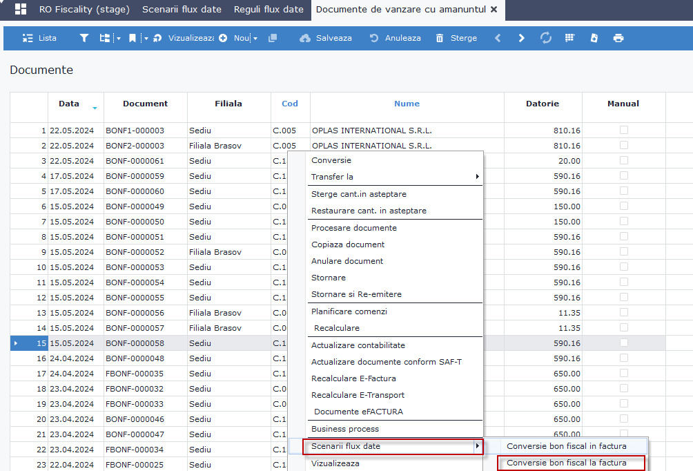 In jurnalul de vanzari sunt afisate facturile la bonuri. Pentru aceasta se tine cont de comportament (acesta trebuie sa fie egal cu 131) si campul FINDOCS sa fie completat. Pentru aceasta, in standard avem definit si un scenariu flux de date, care indeplineste aceste conditii: