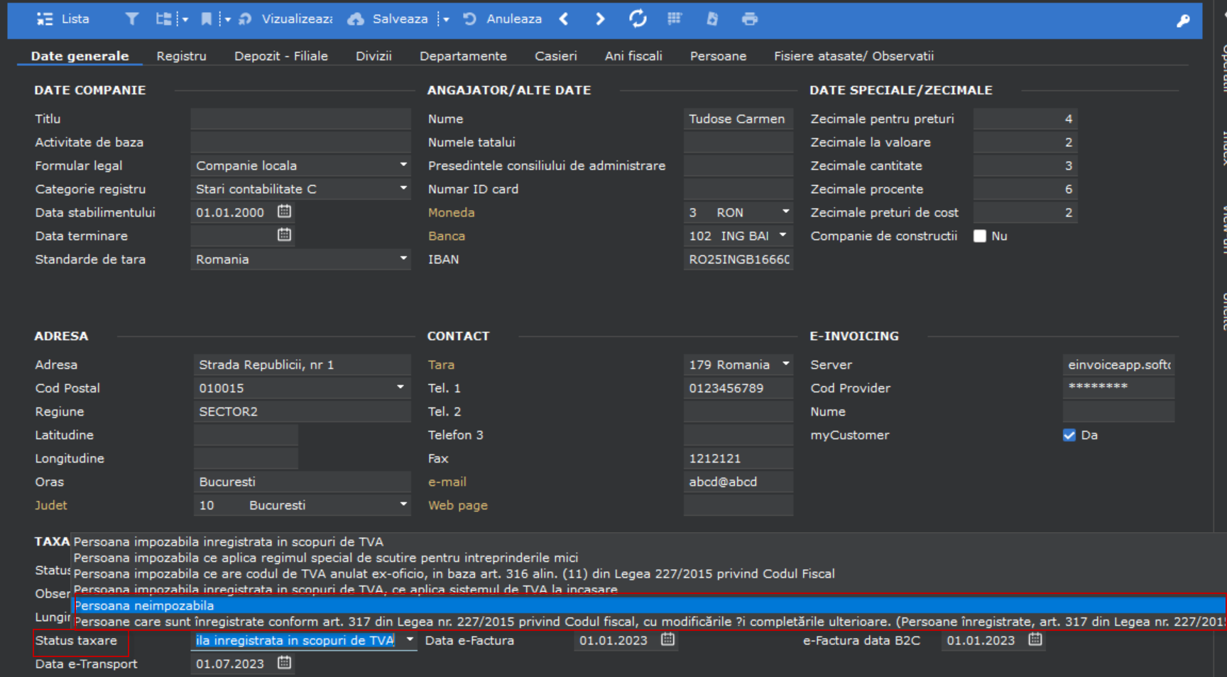 Campul Status Taxare (COMPANY.FISCALSTATUS) se completeaza cu una din cele doua optiuni:
