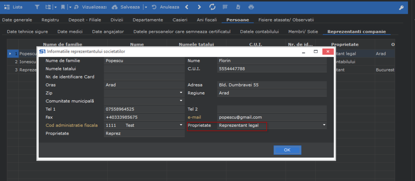 Informatiile reprezentantului companiei se preiau din Reprezentantii companiei, mai exact inregistrarea cu proprietatea Reprezentant legal.