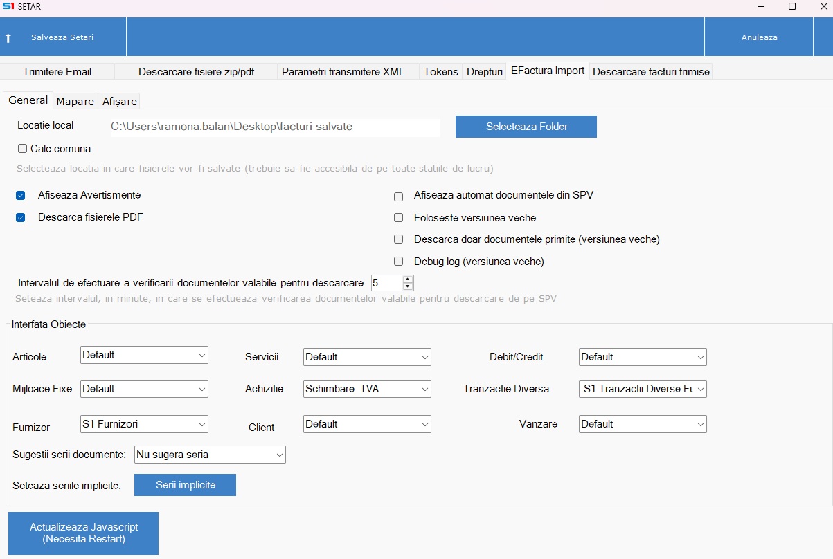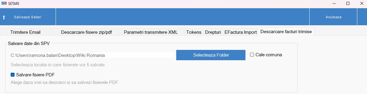 Zonă în care se permite selectarea locaţiei de salvare a facturilor primite prin SPV, şi de asemenea de setare a acesteia ca o cale comună tuturor utilizatorilor.